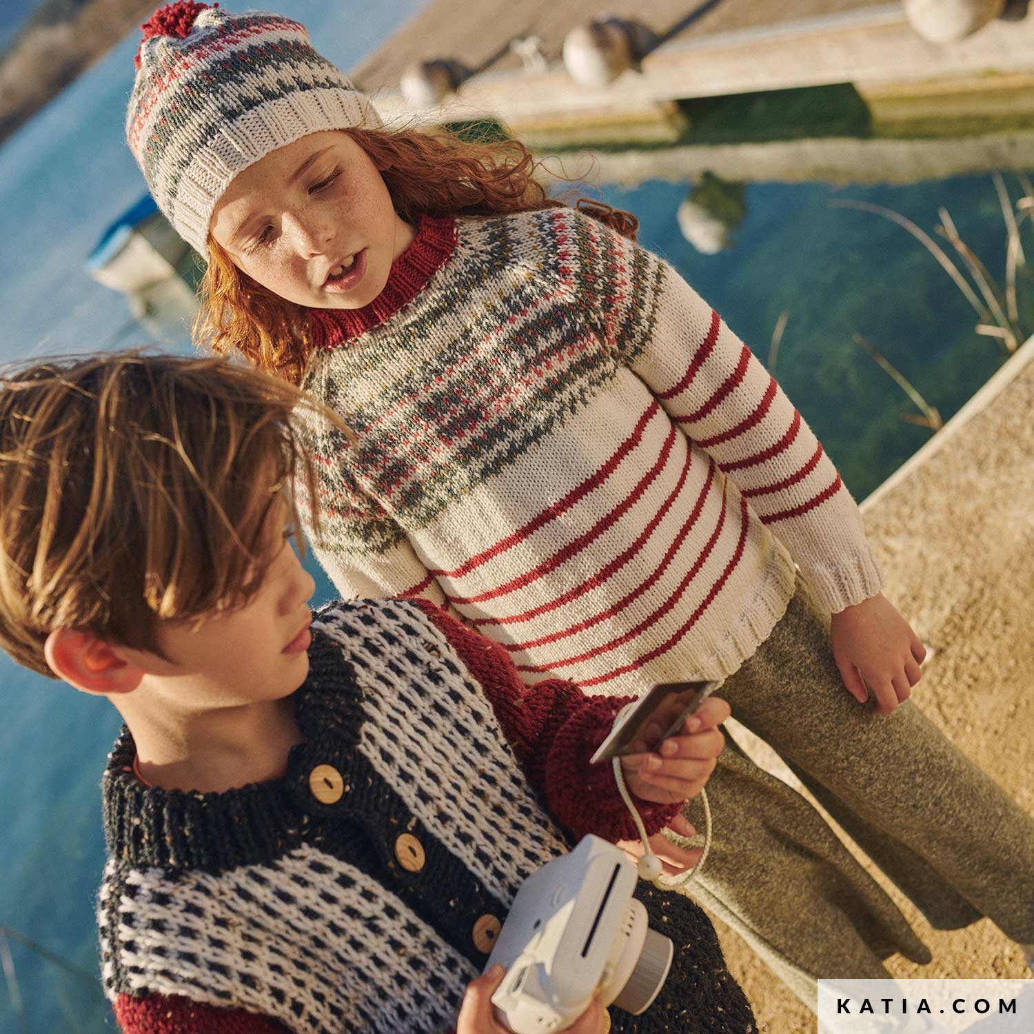 Wzór na czapkę dziecięcą z pomponem i raglanowy sweter z nordyckim wzorem. Najpierw wykonać na drutach prostych wzór w paski z włóczki Arles Merino. Następnie wykonać karczek na drutach z żyłką, wykorzystując efekt kolorowego skandynawskiego nadruku.