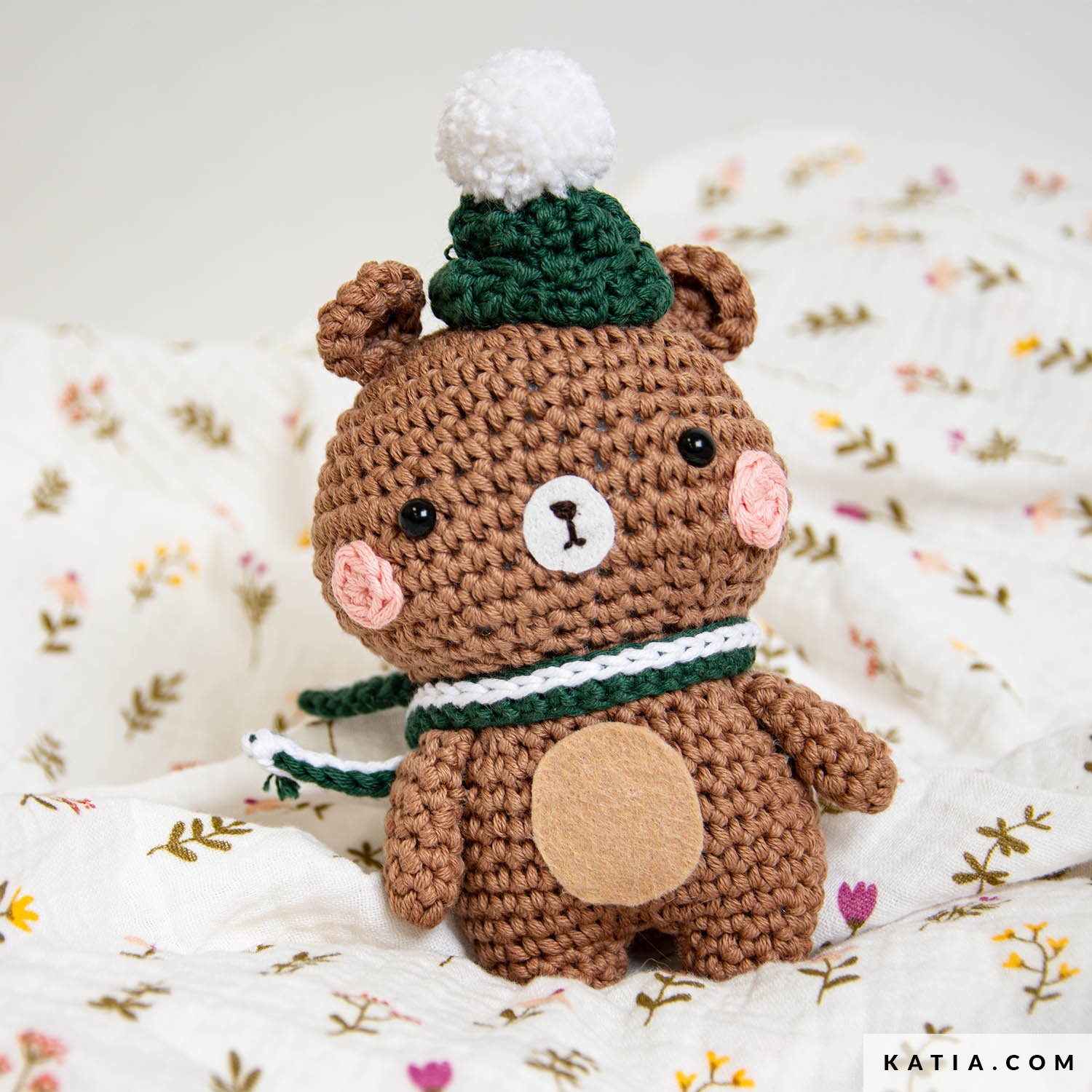 Bernie Bear od Sweet Amigurumi Design to uroczy leśny miś w czapce i szaliku, z różowymi policzkami. Ta postać z kolekcji Forest Friends została wykonana na szydełku z Katia Amigurumi, włóczki 100% bawełnianej o podwójnym skręcie, i ozdobiona drobnymi elementami z filcu.
