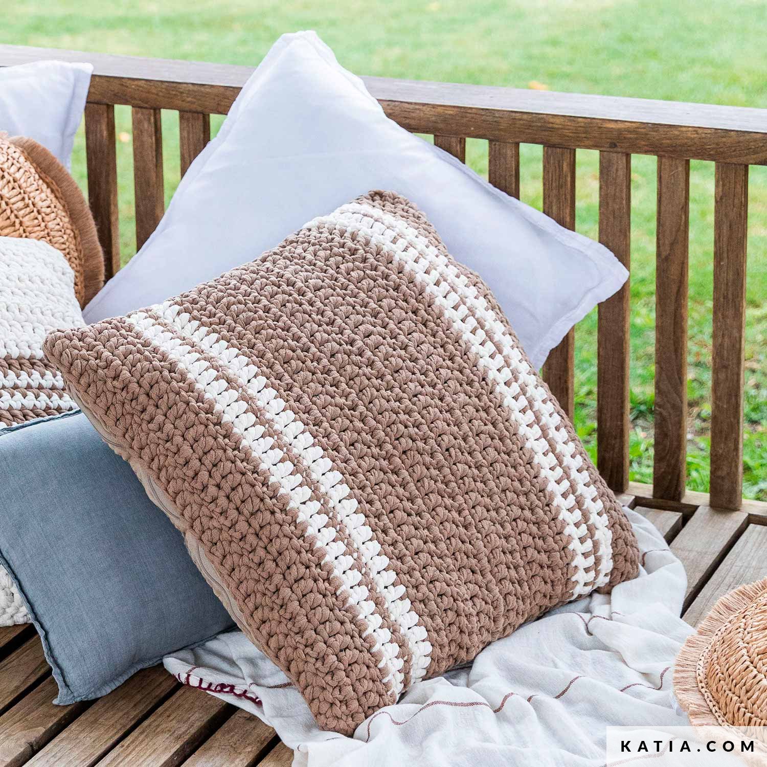 Jeśli szukasz naturalnego i prostego stylu dla swojego domu, oferujemy parę prostych poduszek szydełkowych z zawsze modnym wzorem w paski. Połącz Big Ribbon i Alabama, dwie bardzo różne przędze, aby stworzyć dwie różne tekstury po każdej stronie poduszki. Baw się kontrastem kolorów, aby udekorować swoją ulubioną sofę lub fotel i parę poduszek z dużą osobowością.