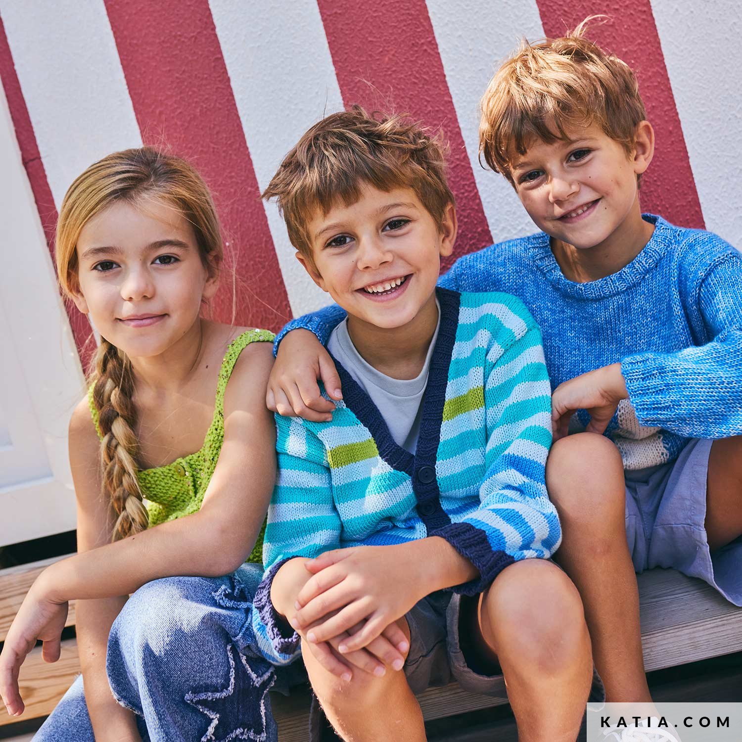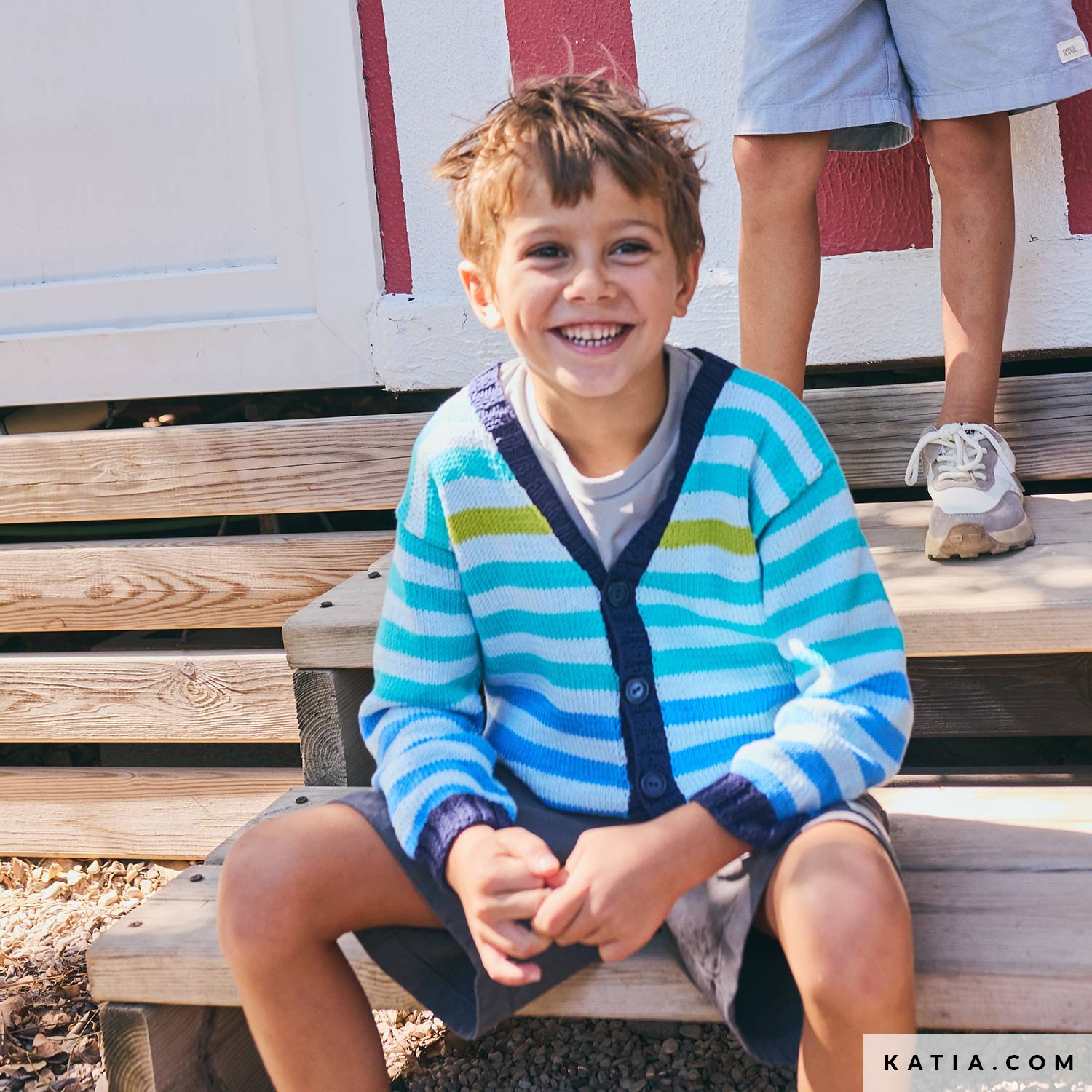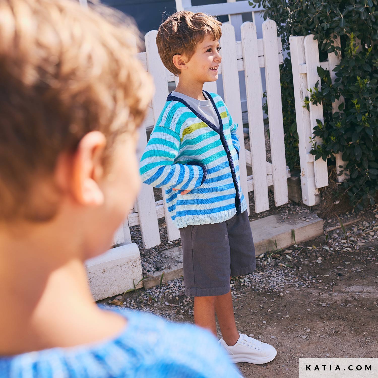 Ten kardigan na drutach łączy miękkość organicznej bawełny Katia Fair Cotton z wesołą grą pasków w świeżych tonach. Wyróżnia go dekolt V, długie rękawy i kontrastowe wykończenia dla czystego, nowoczesnego looku. Lekki, wygodny i idealny na co dzień. Dostępny w Katia Niños 117 i w PDF na katia.com. Wydziergaj do jego garderoby kolor i radość.