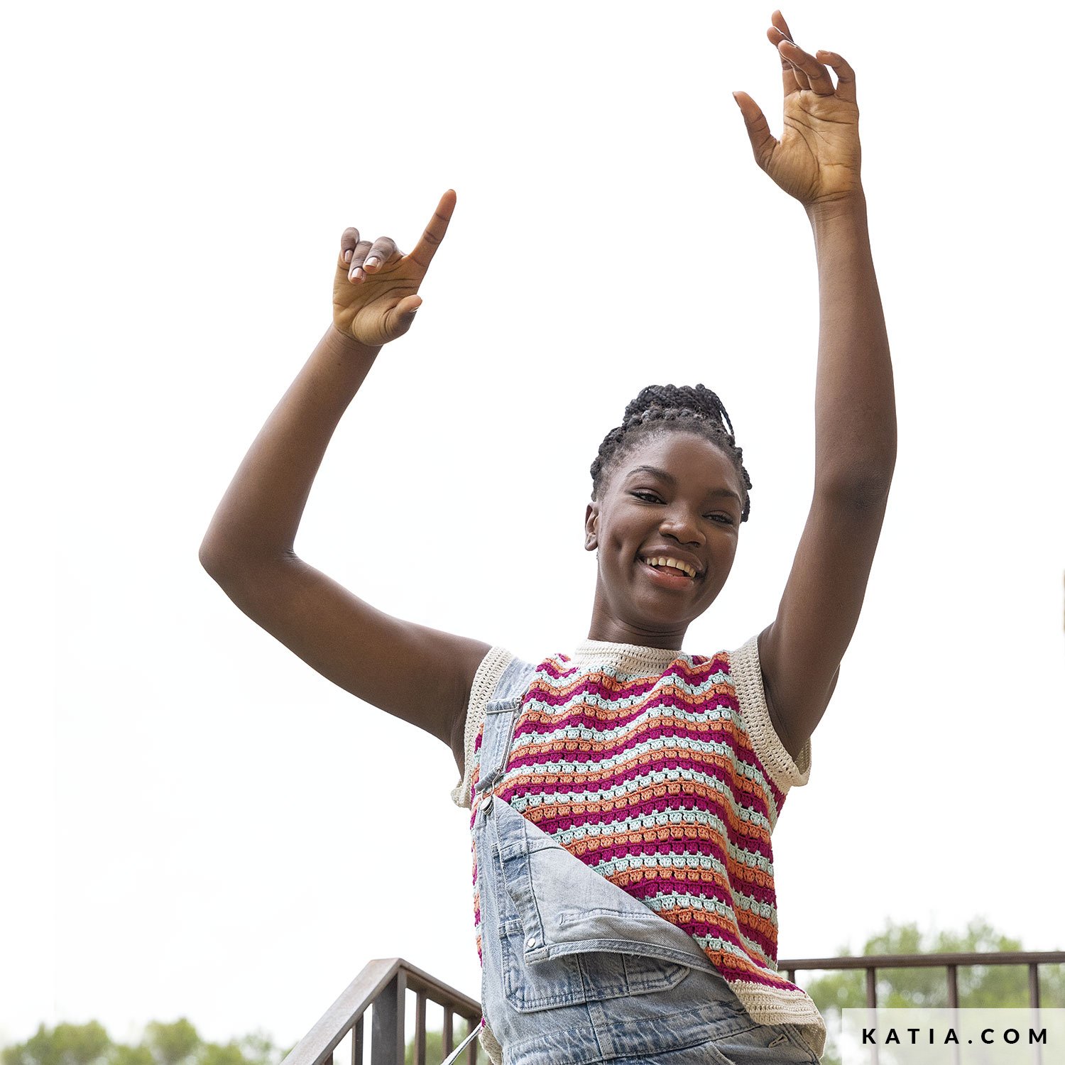 Odmień swój letni look dzięki temu fajnemu i młodzieżowemu topowi na szydełku! Ciesz się tworzeniem inspirowanego stylem retro nadruku w paski łączącego miękkie kolory przędzy Panama. Okrągły dekolt dodaje nowoczesnego wyglądu, a białe obwódki stanowią idealne wykończenie tego topu bez rękawów.