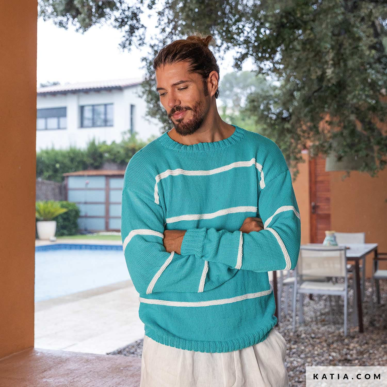 Odkryj wzór na ten męski sweter w paski w magazynie Katia Casual 120. Dziergany na dwóch drutach z Katia Fair Cotton, miękkiej i lekkiej organicznej bawełny, jego projekt z okrągłym dekoltem i długimi rękawami jest idealny na lato. Wybierz spośród 42 kolorów Katia Fair Cotton i stwórz niepowtarzalną odzież własnoręcznie.