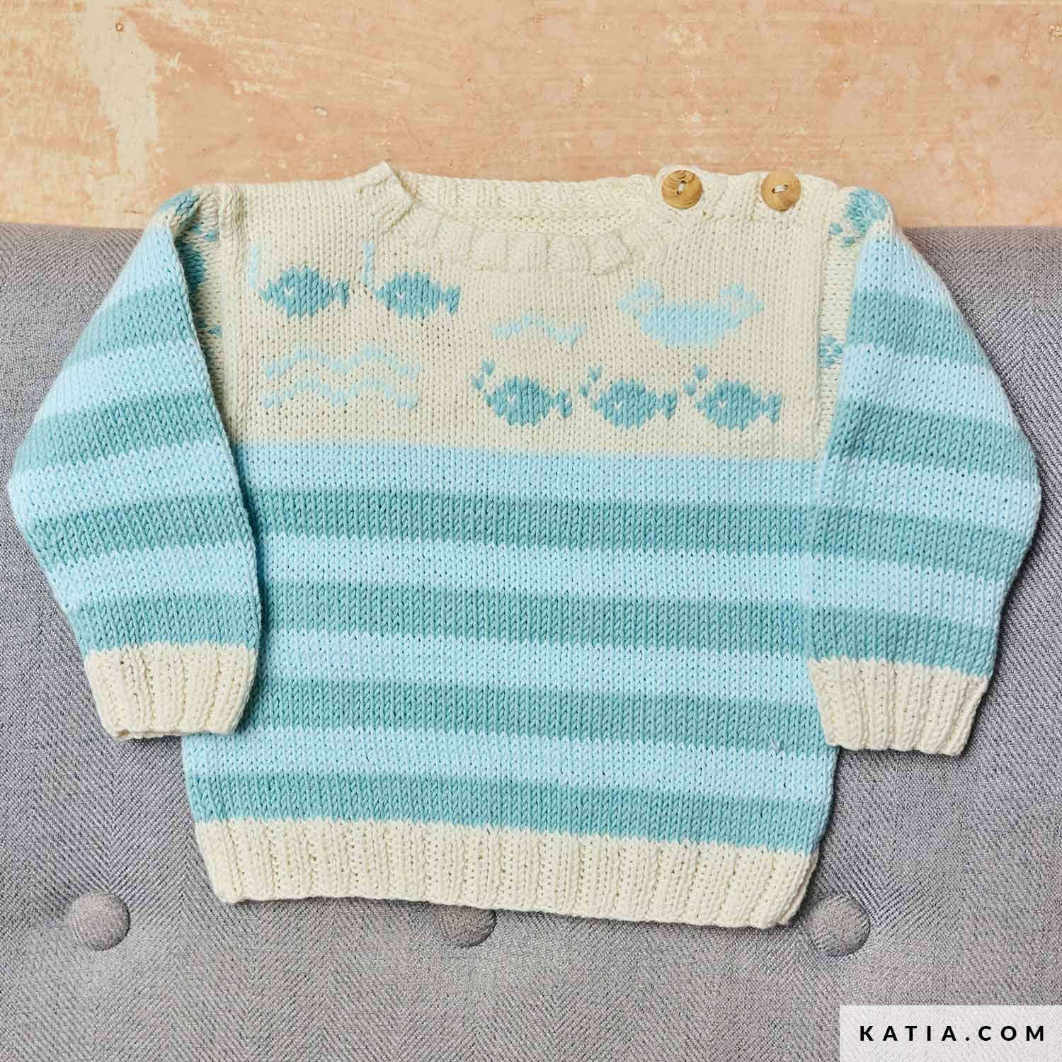 Ten sweterek dla niemowlęcia dziergany na drutach z Katia Panama – miękkiej i lekkiej bawełny. Góra gładka z urokliwymi rybkami haftowanymi żakardem, korpus i rękawy w paski. Wzór w Katia Bebé 116 i w PDF na katia.com. Stwórz wesołą, wygodną rzecz dla malucha.