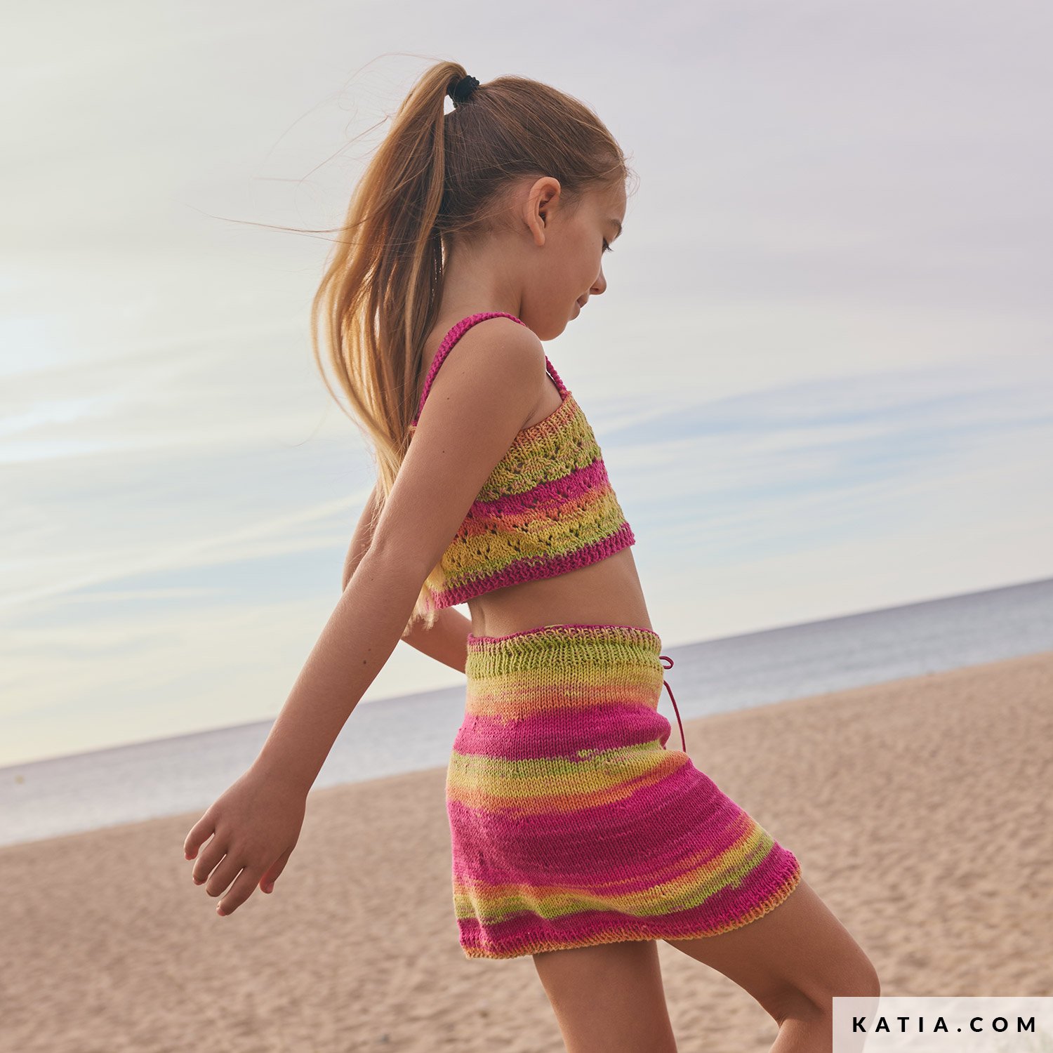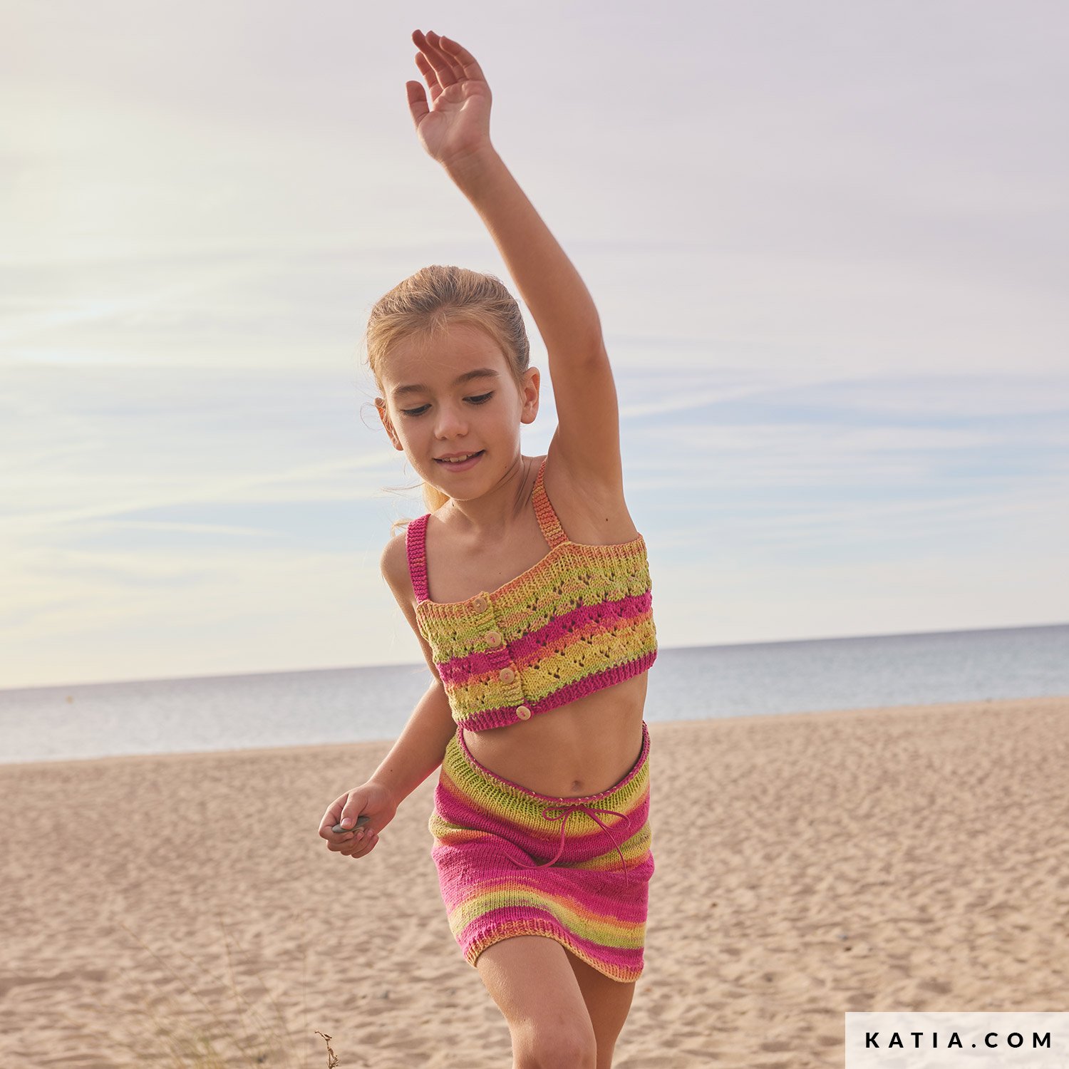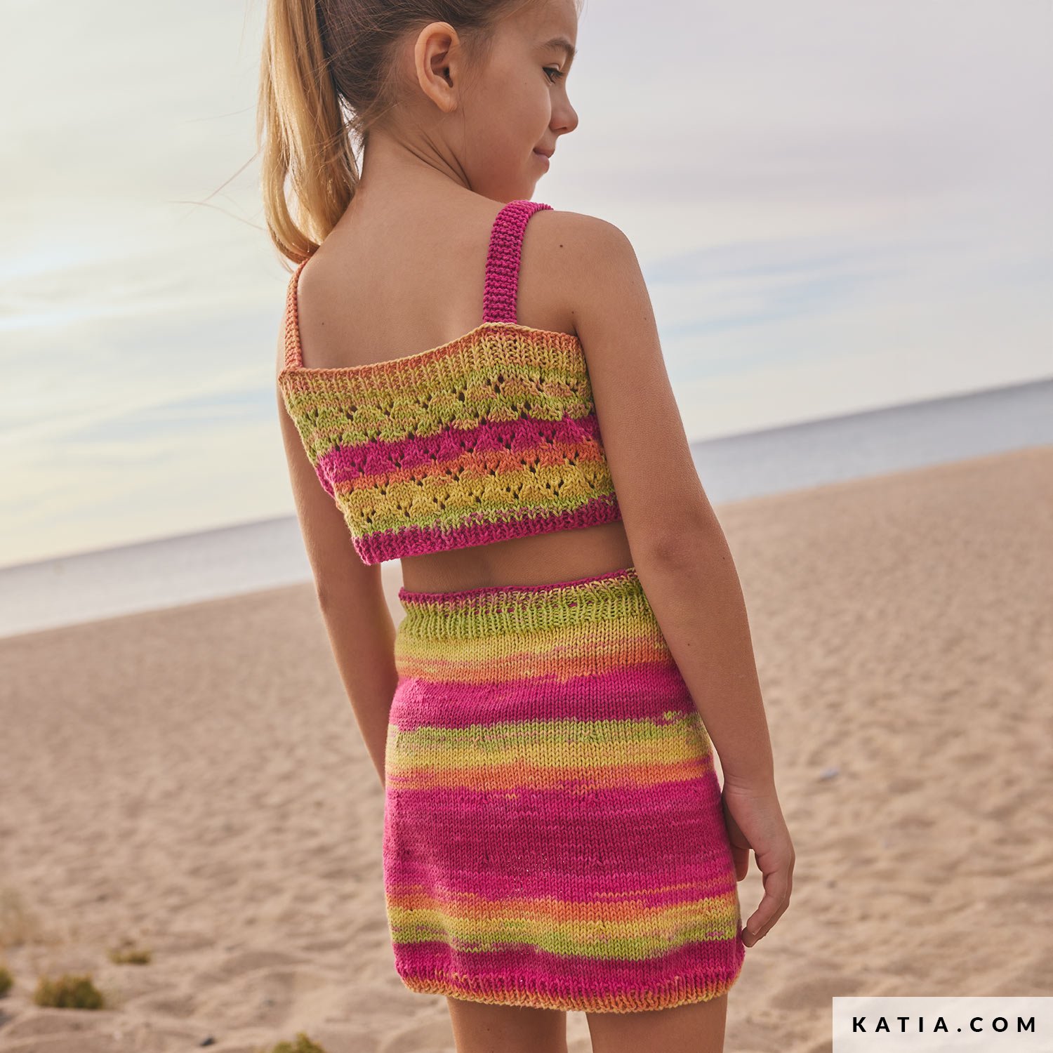 Dodaj letni akcent do garderoby córki tym krótkim, ażurowym topem dzierganym na drutach z Katia Menfis Color – miękkiej bawełny w żywych barwach. Na ramiączkach, z guzikami z przodu; część zestawu z prostą spódnicą do najcieplejszych dni. Wzór w Katia Niños 117 i w PDF na katia.com. Stwórz handmade dla swojej córki.