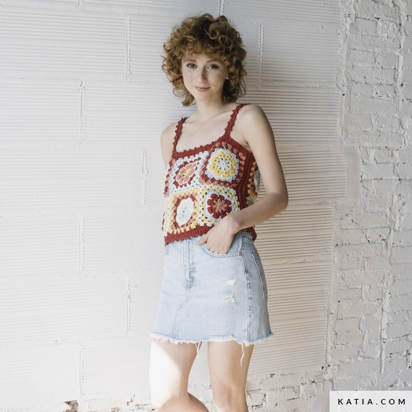 Zaimponuj znajomym, nosząc ten ręcznie wykonany crop top w stylu retro! Zdobądź zestaw African Flowers Kit, składający się z kulek bawełny SeaCell Cotton w 6 różnych kolorach, szydełka, igły do gobelinów, wydrukowanego wzoru - dostępnego w jednym rozmiarze - oraz dostępu do samouczka wideo za pomocą kodu QR. Tego lata ciesz się szydełkowym crop topem składającym się z kwiatowych kwadratów granny zaprojektowanych przez Leire Villar @ameskeria dla Katia's Kits & Fun Happy Summer.