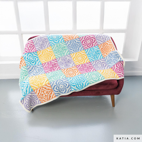 · Projekt: Koc z 35 granny squares wykonanych techniką szydełkowego mozaikowego crochet.