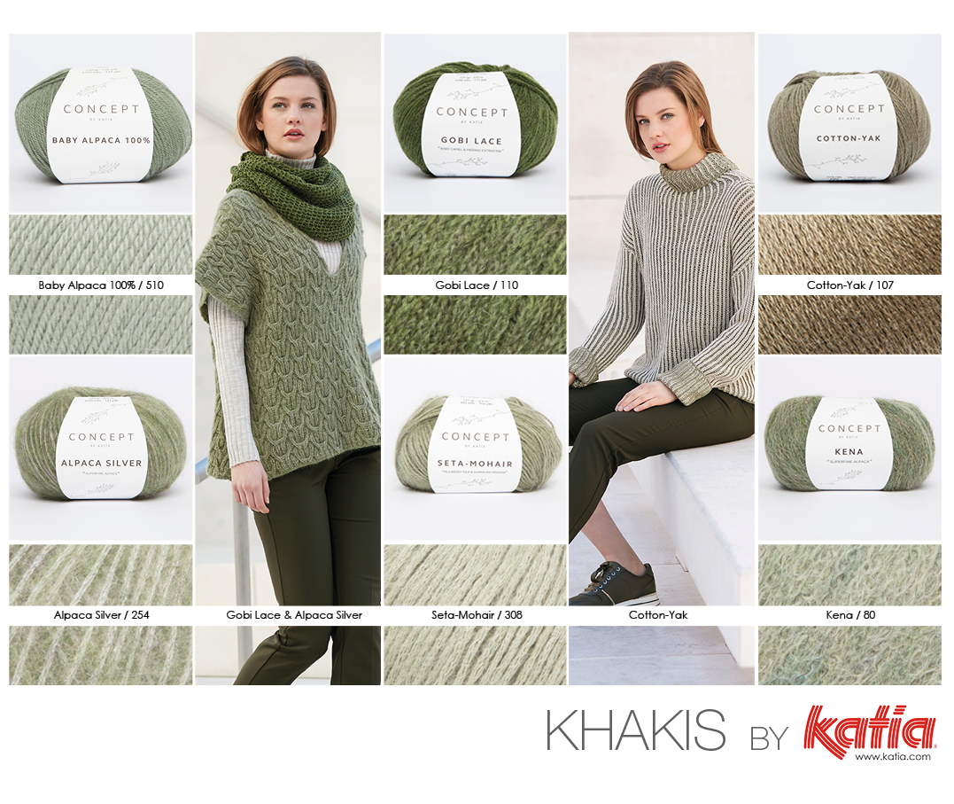 Khaki green, originally used for military uniforms, is in fashion. Surely this is because it´s so easy to combine with black, white or beige amongst other colours. In the new Katia collection you´ll find different intensities of khaki green in Baby Alpaca 100%, Seta-Mohair, Kena...