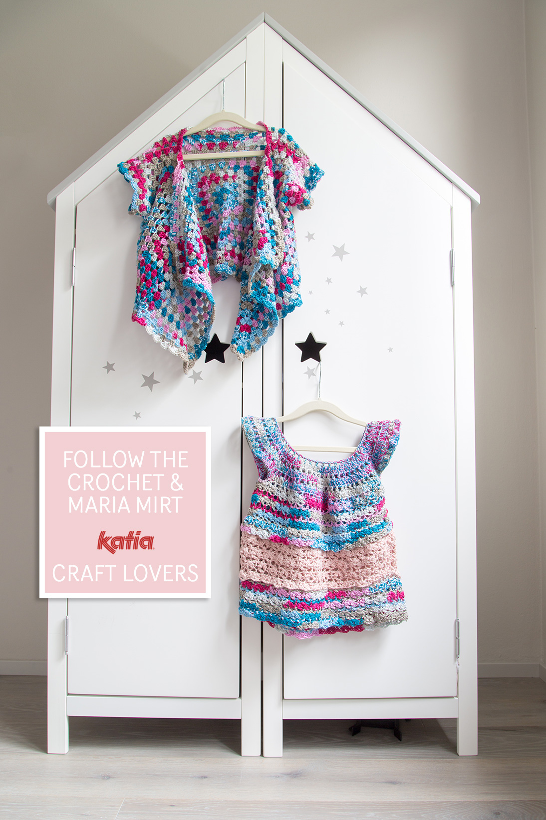 We are Samanta Fornino (Follow the Crochet) and Maria Mirt (I mieilavoriall´uncinetto) and we want to present you with this crochet Mother Daughter set. We’ve called this project, comprised of two crochet garments made from Katia Capri Plus and Katia Polynesia, Mini Me. We love the combination of these two yarns! On the one hand, because of the bright strong Capri Plus colours; and on the other hand, because of the delicate Polynesia colour range. Follow our crochet Mother Daughter tutorials and discover how easy it is to make this dress and waistcoat set. Of course, we’d also like to encourage you to make this set so that you can match your look together with aunts, nieces, grandmothers and granddaughters.