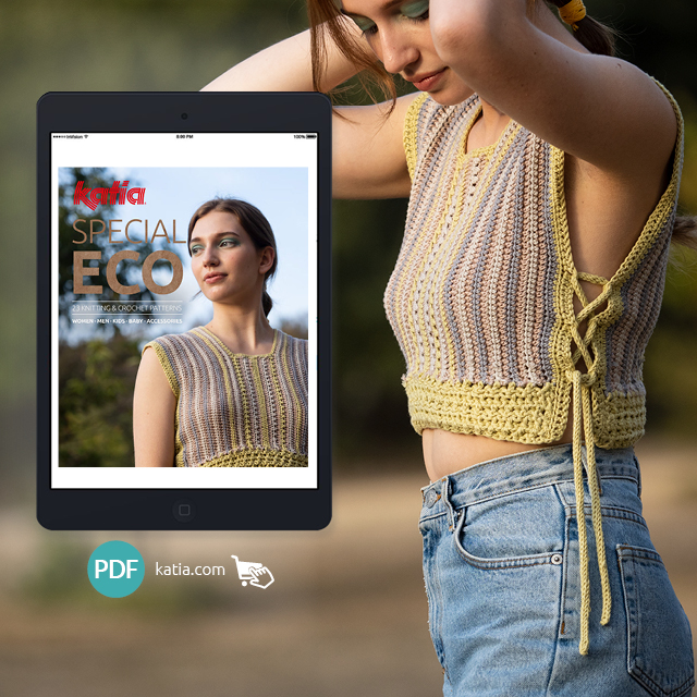 Then take Katia Special ECO PDF* with you, whether it’s on your computer, tablet, or your Smartphone. Download 23 knitting and crochet patterns for all levels. You will find a wide selection of clothings for women, men, kids, baby and home. Get yourself the best of Katia Spring Summer designs.