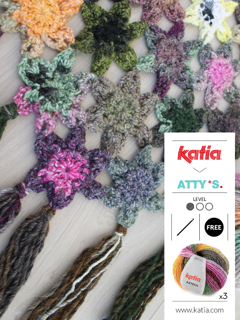 Combate el frío con flores, ¡muchas flores de ganchillo! Desde Países Bajos y de la mano de Atty van Norel te proponemos hacer el Chal Flores a Crochet. Este diseño fue la sensación entre las asistentes a nuestro taller en el reciente KreaDoe, el salón creativo de Utrecht. Queremos compartir ese entusiasmo que vivimos con las tejedoras holandesas. Por eso, te invitamos a descargar el patrón gratuito y a escoger el color de los 3 ovillos Katia Azteca que necesitas para hacer tu Chal Flores a Crochet. ¡Rodéate de flores con este espectacular complemento!