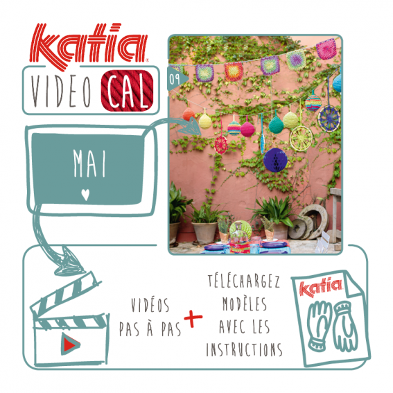C´est la saison des jours fériés! Alors préparez- vous avec notre triple Katia VidéoCal de mai. Nous vous proposons de décorer l’intérieur et l’extérieur de votre maison avec ces joyeuses guirlandes de boules, d´anneaux et de granny squares. Suivez nos vidéos et les patrons pour faire de ce mois de mai une vraie fête pleine de couleurs avec ces 3 guirlandes travaillées au crochet.