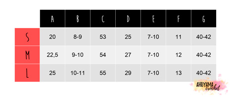 Qui di seguito le immagini con la forma e le misure di ciascuna parte indicate nella tabella delle taglie (in cm).
