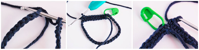 Gambe (x2). Le gambe si lavorano come le braccia ma con il blu marino, senza cambio di colore e omettendo la lavorazione da dietro del giro 11.
