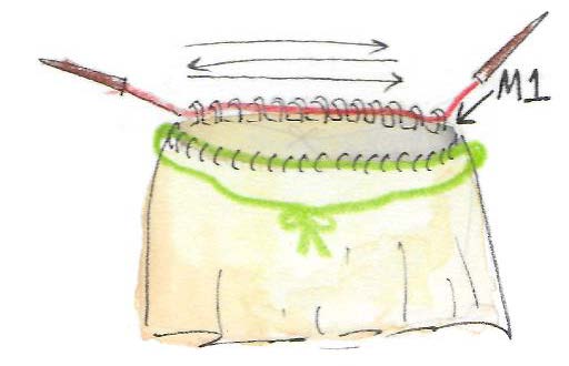 Con KATIA ULTRASOFT col. 62, i ferri da 4,5mm e il cavo da 80/100cm avviare a) 152, b) 158, c) 164, d) 174, e) 182, f) 190, g) 198, h) 204, i) 212, j) 222m. Inserire M1 e unire in tondo.