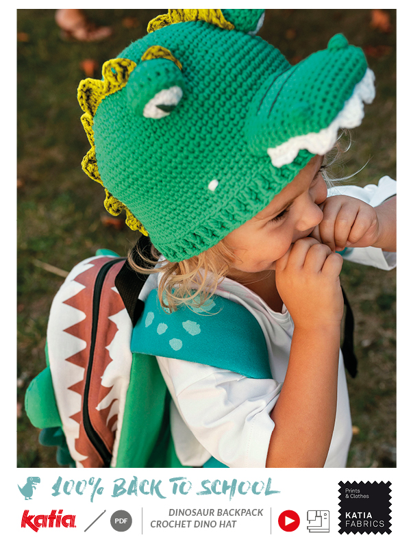 Impara a confezionare uno zaino dinosauro con un pannello Katia Fabrics e realizza un Cappellosauro all’uncinetto abbinato