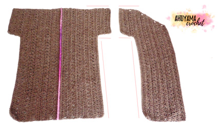 We nemen deze 2 delen samen aan het rugpand door middel van het haken van halve vasten over de zijkanten en de schouders, zoals te zien is op de volgende afbeelding. De basis van de jas is nu gevormd.