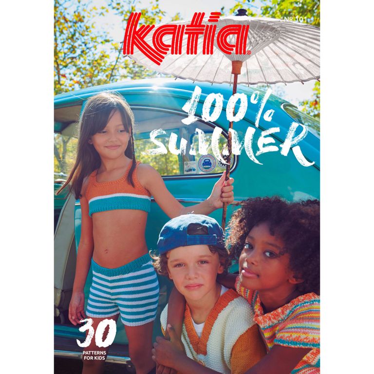 In the Katia 100% Summer eBook, you’ll find 30 designs, mainly knitting patterns and one interesting crochet design, to dress the youngest members of the family in 100% handmade clothes. We suggest a wide range of daywear pieces for children that you can knit in sizes 2 to 12 years. Dresses, summer tops, shorts, T-shirts, cardigans, and sweaters made with the most comfortable, soft, and colorful Katia yarns. This spring-summer, choose a fun and playful color range: purple and pistachio green, mustard and green, pink and turquoise, blue and orange. Enjoy knitting kids’ clothes with stripes, checks, simple lace, classic cables, textured stitches, granny squares... to amaze the youngest members of the family this summer.