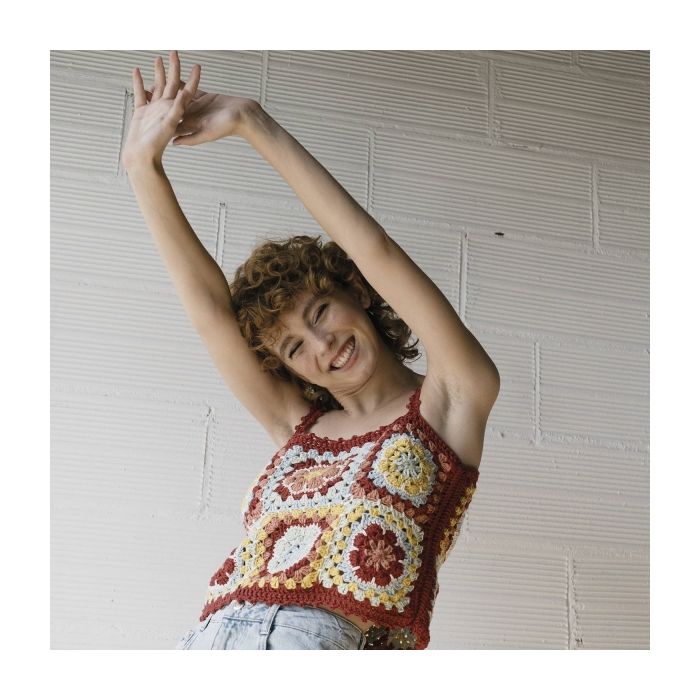 This summer, enjoy a crochet crop top consisting of flower granny squares designed by Leire Villar @ameskeria!. Impress your friends by wearing this retro style crop top handmade by you! Get the African Flowers Crop Top, You only need balls of Seacell Cotton in 6 different colors!