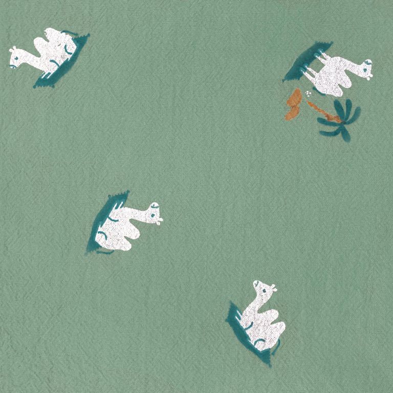 100% rustic look cotton fabric with a camel and magic carpet print design on a green background. A lightweight fabric with a soft handle and more body than our normal poplin fabric. Sew garments for autumn and winter like dresses, trousers blouses and all in ones.