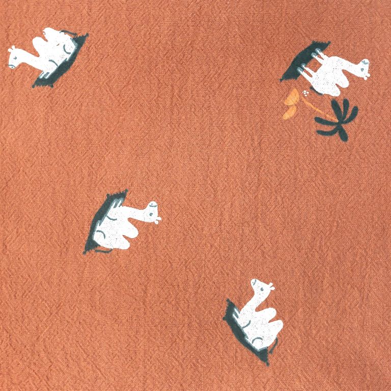 100% rustic look cotton fabric with a camel and magic carpet print in a terracotta colour. An easy fabric to sew, especially for garments like dresses, skirts, blouses and all in ones.
