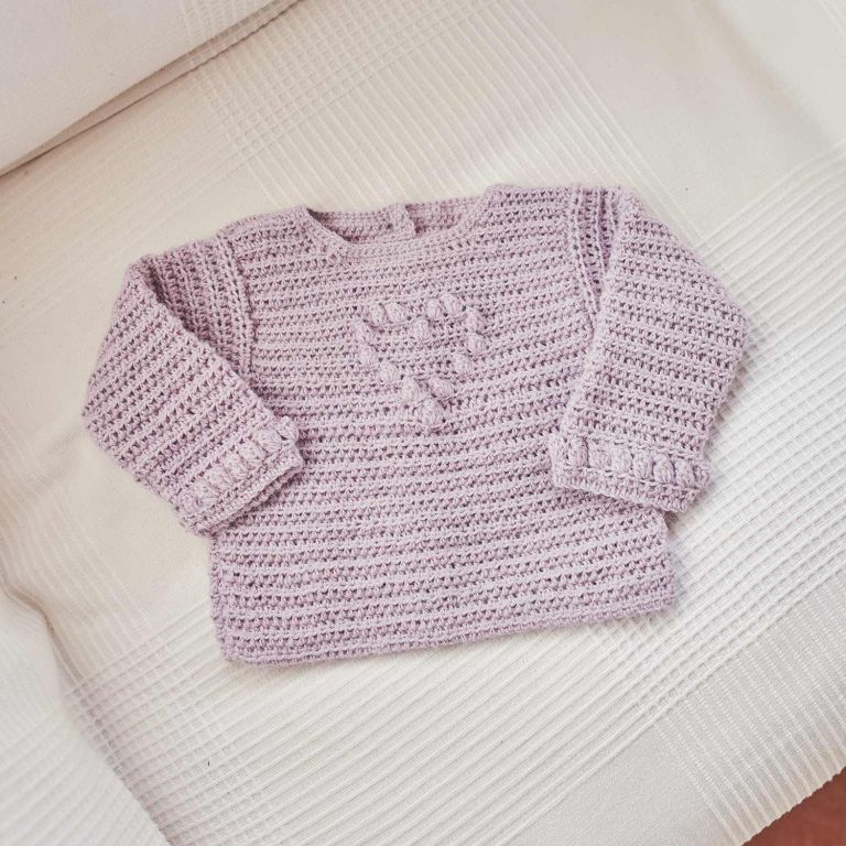 Alpaquina bobble heart sweater crochet pattern Crochet a lovely baby sweater with our heart and bobble stitch pattern in Concept by Katia’s Alpaca yarn! With details at the cuffs and a popcorn stitch heart, this design is perfect for newborns, 3- and 6-month-old babies. Additionally, the Superfine Alpaca yarn allows for machine washing for the best care of your knitwear. Grab your crochet hook and enjoy every stitch!