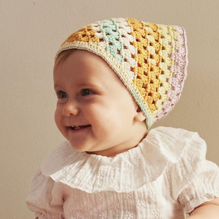 Complete your baby’s look with this charming Granny Square crochet bandanna, made with leftover Katia Fair Cotton Diverso from the knitted blanket or Katia Fair Cotton in a solid color. Easy to crochet, its unique multicolor design is both practical and adorable. Create a special accessory for your baby while enjoying the art of handmade things.