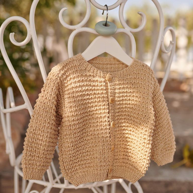 Cotton-Cashmere Fisherman’s rib baby cardigan pattern This baby cardigan, knit by alternating Fisherman’s rib with two rows of stockinette stitch, is perfect to keep your little one warm with Cotton-Cashmere, a soft and elastic yarn. The 1x1 rib neckline, cuffs, and button bands provide comfort, as well as the 5 wooden buttons that fasten the jacket. Enjoy knitting these instructions for sizes 3 to 24 months in your favorite color.