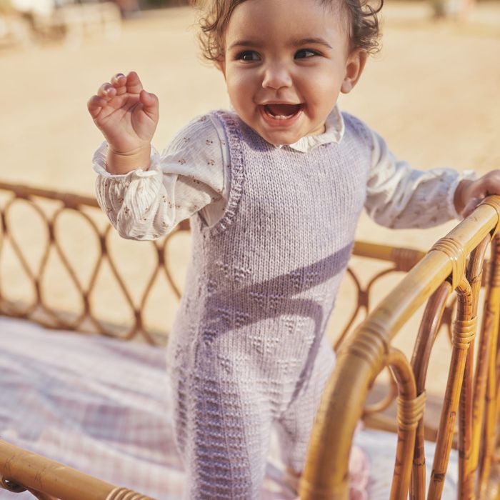 Cotton-Merino Fine textured motif romper kit Knit a soft, sleeveless, long baby romper with three different stitch blocks: stockinette, garter stitch butterflies, and textured rectangles. Featuring 5 small buttons on the back and finished with 1x1 ribbing, this kit is perfect for hand-knitting with Concept by Katia’s Cotton-Merino Fine yarn.