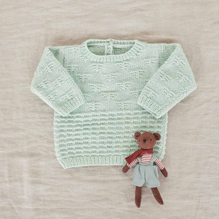 Cotton-Merino Fine textured butterfly sweater kit Knit a sweet baby sweater with a textured butterfly pattern! Use Concept by Katia’s Cotton-Merino Fine yarn to create a design in two blocks with butterfly and rectangular motifs. Easy to knit with straight needles and finished with 1x1 ribbing.