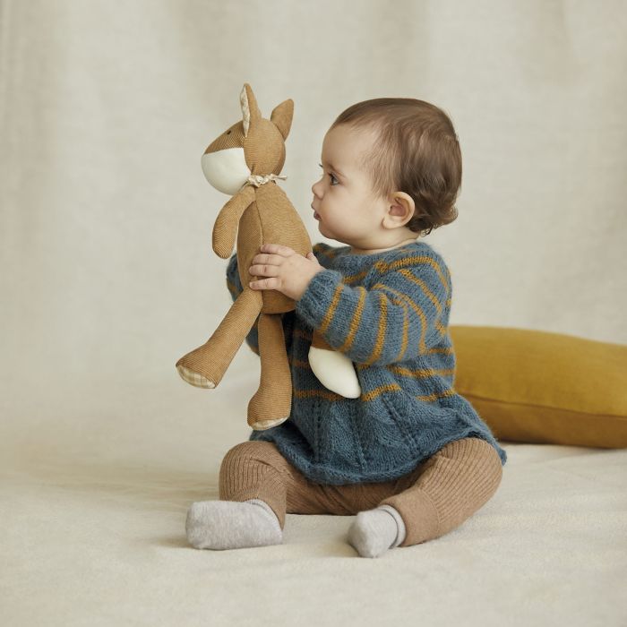 Soft Gratté striped and lace baby dress pattern Knit a baby dress combining stripes on the sleeves and top with vertical lace motifs on the skirt. Choose two colors of Soft Gratté and enjoy this pattern available in sizes 2 to 24 months.