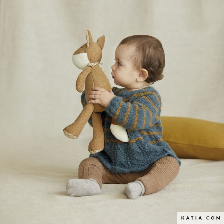 Soft Gratté striped and lace baby dress pattern Knit a baby dress combining stripes on the sleeves and top with vertical lace motifs on the skirt. Choose two colors of Soft Gratté and enjoy this pattern available in sizes 2 to 24 months.