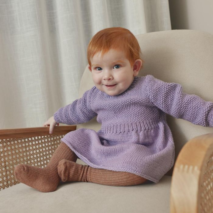 Create a comfortable and elegant baby dress with this knitting pattern. The body and sleeves are worked in seed stitch for texture, while the skirt in stockinette stitch adds lightness. Choose your favorite shade of Concept Merino Baby or Katia Peques and lovingly knit a soft and special everyday garment.