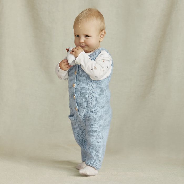 Merino Baby cabled overalls with pockets pattern Dress your baby in this comfortable and warm long romper or overalls knit in garter stitch with Merino Baby. Enjoy its unique details such as the cables that grow out of the pockets or the front closure with 5 wooden buttons.