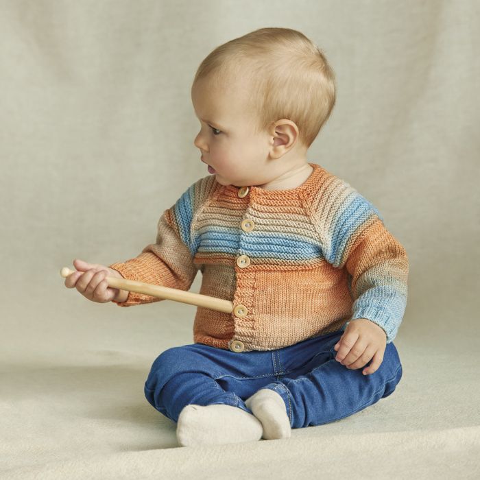 Merino Baby Aquarelle raglan-sleeve baby jacket kit With just a few stitches, achieve an interesting play on textures using the soft multicolor Merino Baby Aquarelle yarn. Knit a different pattern: a baby cardigan with textured raglan increases in sizes 3 to 24 months.
