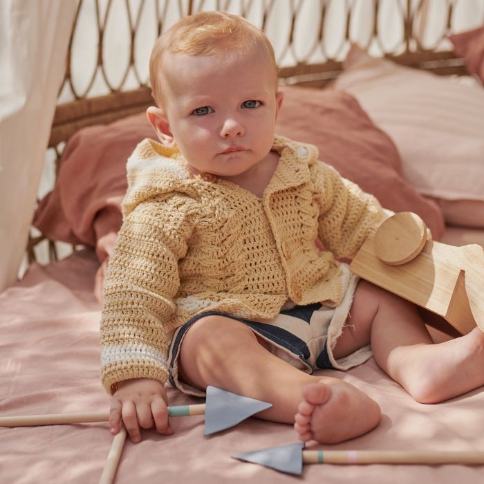 Missouri hooded baby jacket crochet pattern This baby hooded jacket crochet pattern is made with beautiful Missouri yarn. The jacket features a hood, cabled fronts, and is fastened with 4 wooden buttons. The white stripe around the cuffs, hems, and edge of the hood adds a modern vibe.
