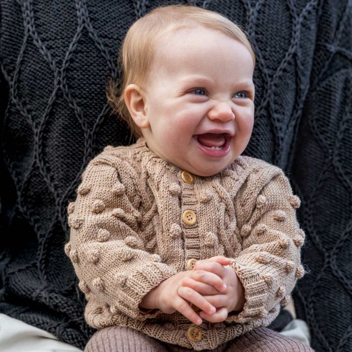 Merino Baby bobble and diamond baby cardigan kit Create a unique garment for your baby’s layette with this round-necked, cardigan knitting pattern. Knitted in stockinette stitch with details such as bobbles, diamond stitch cables, and eyelets to create a classic and timeless look, perfect for experienced knitters. Use the soft Katia Merino Baby wool to knit a high-quality garment, with Total Easy Care treatment for machine washing and drying.