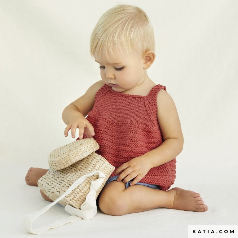Cool designs for babies! Follow this knitting pattern available for sizes 3 to 24 months to knit a strappy baby top. Play with garter stitch and stockinette stitch to achieve a fun texture and use Sweet Cocoon to add elasticity to this comfortable piece.