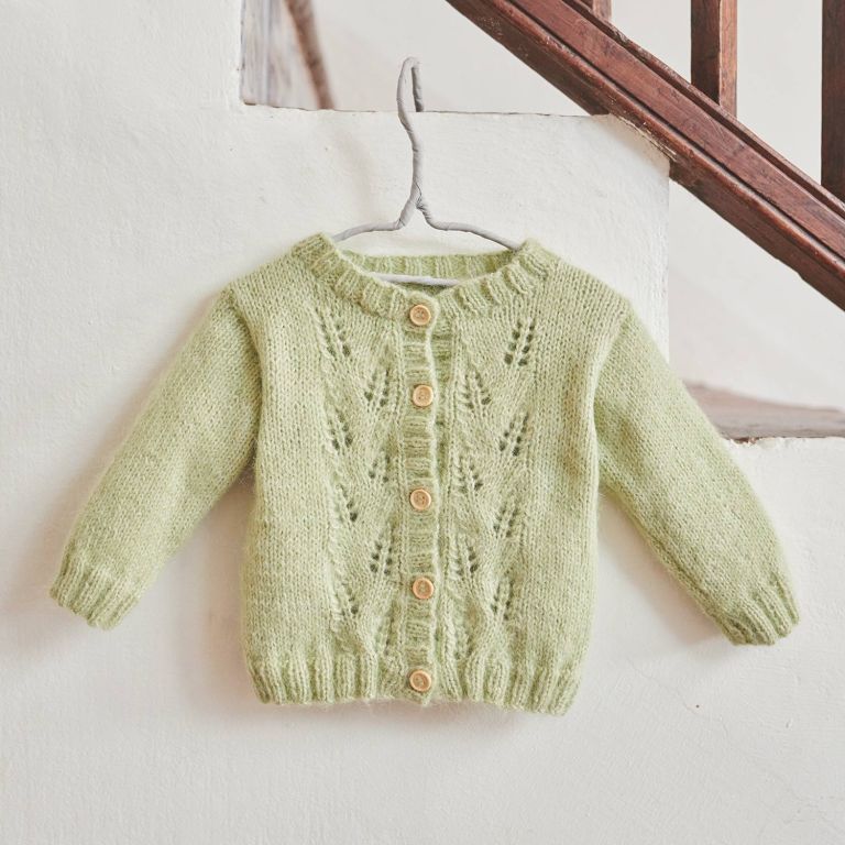 Soft Gratté lace motif baby cardigan pattern Knit a baby cardigan with lace motifs using Soft Gratté! This pattern is available in PDF format and in the Katia Baby 106 magazine with instructions for sizes 3 to 24 months. Use Katia Soft Gratté yarn, a delicate plant-based yarn. The jacket is lightweight and soft, with 2x2 ribbed finishes and wooden buttons.