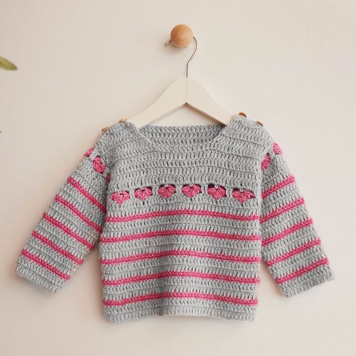 This adorable striped crochet sweater, made with Puro Cotone by Concept by Katia, is soft and perfect for sensitive skin. Its design features a sweet line of hearts and shoulder buttons for added convenience. Available in the Katia Baby 112 magazine in sizes 3 to 24 months. Create with love and enjoy the art of handmade things.