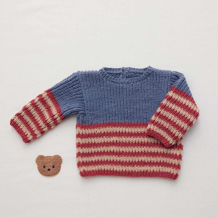 Add warmth and style to your baby’s wardrobe with this fisherman’s rib sweater pattern. With a back opening with three buttons, it combines a solid-colored yoke with two-toned stripes on the body and sleeves. Knit it using Concept Merino Baby or Katia Peques for a soft, fun, and everyday piece.