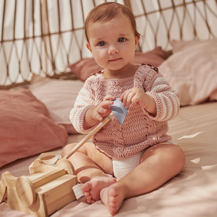 Missouri striped and cabled baby sweater crochet kit This crochet baby sweater kit is made with Missouri yarn in pink and white. The sleeves are striped, while the front and back feature double crochet and cables. This design is completed with 3 buttons at each shoulder. Follow the kit to crochet a sweater in sizes 3 to 24 months.
