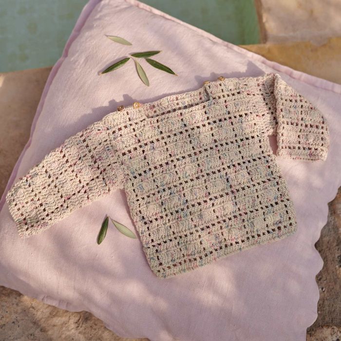 Sonajero lace mesh baby sweater crochet pattern Are you looking for a cute baby sweater pattern using Sonajero yarn? This lace mesh crochet pattern is perfect for you! The sweater features a lace mesh fantasy stitch, and the neckline is left raw. Follow this pattern for sizes 3 to 24 months.