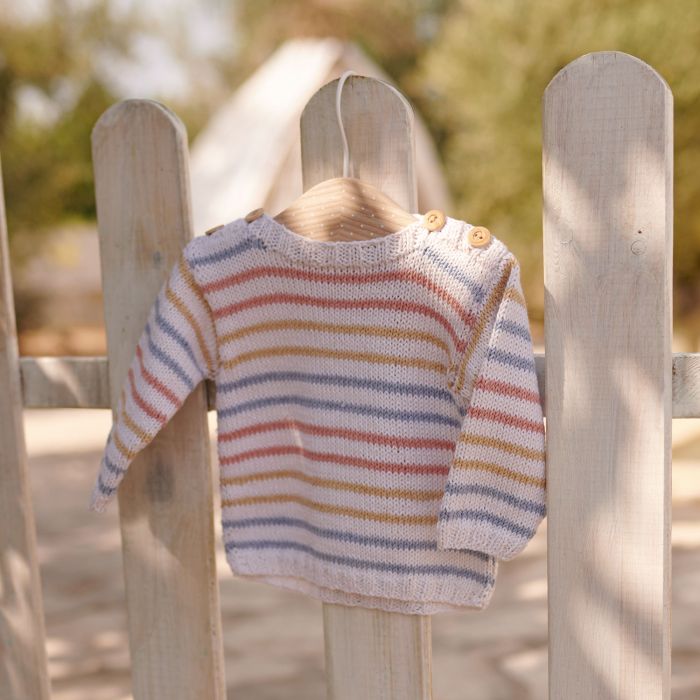 Cotton-Cashmere colorful striped baby sweater kit This beautiful colorful striped baby sweater is knit in stockinette stitch in a lovely blend of cotton and cashmere. It features an elegant opening on each shoulder with two wooden buttons. This kit is very easy to follow! Cotton-Cashmere yarn is soft and warm, so this is the perfect sweater for spring or fall.