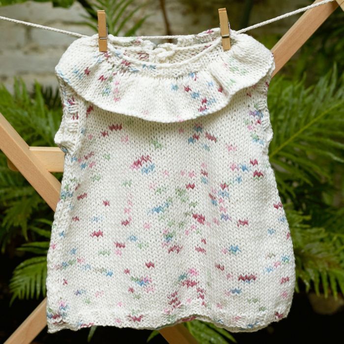 A fun sleeveless baby top with a round frilled neckline knit with Sonajero, a speckled colored cotton. Knit this baby top from size 3 to 24 months with just one or two balls of Sonajero.