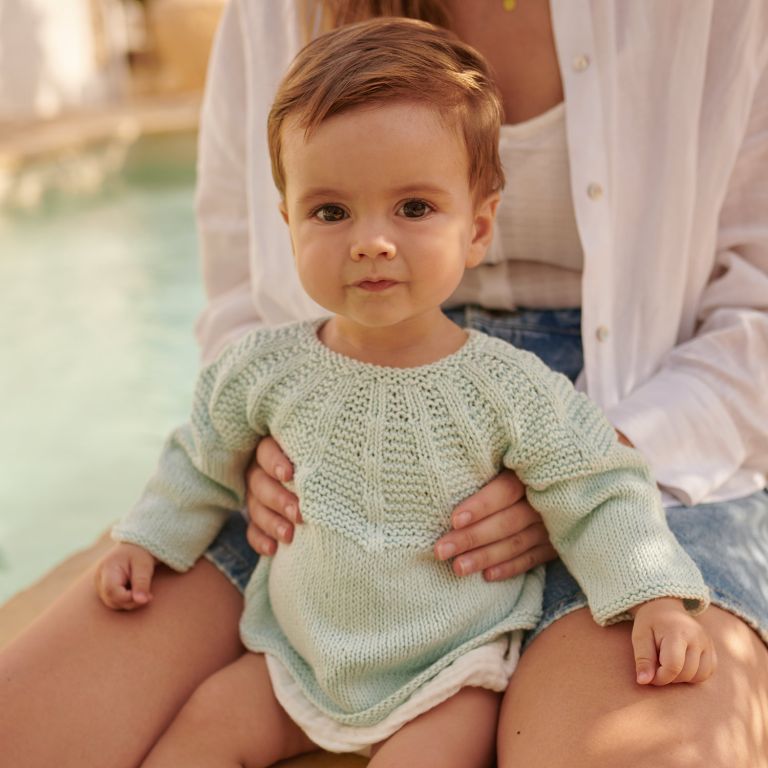SeaCell Cotton baby sweater and booties pattern This cute baby sweater is knit seamlessly, with a round yoke and garter stitch finishes. The back is open and is fastened with some buttons, so that you can dress your baby easily. This sweater is available in sizes newborn to 6 months, and is made with SeaCell Cotton, a soft and comfortable yarn. Dress your baby in the matching sweater and garter stitch baby booties. The pattern comes in sizes 0 to 3 months, and the ankle strap fastened with a wooden button allows you to adjust the size to your baby’s feet.