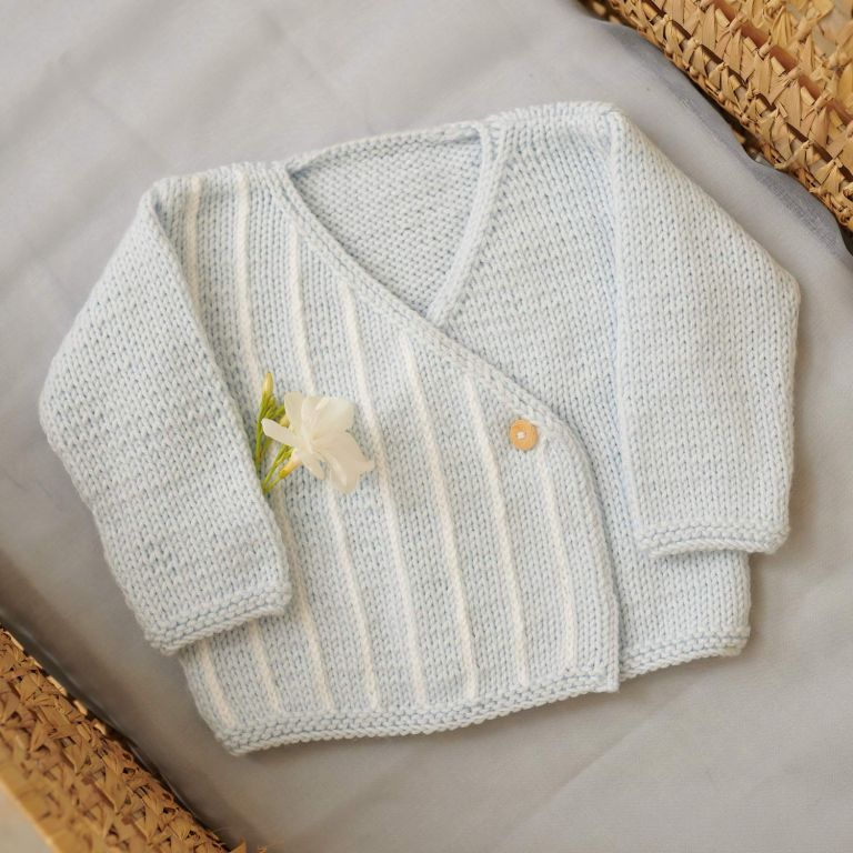 Baby Ultrasoft crossover baby tee knitting pattern This baby T-shirt pattern with a crossover front is perfect for babies from 3 to 24 months. The front is knit with Baby Ultrasoft in blue and decorated with vertical crochet chain stitches. The wooden button gives it a natural and elegant vibe.