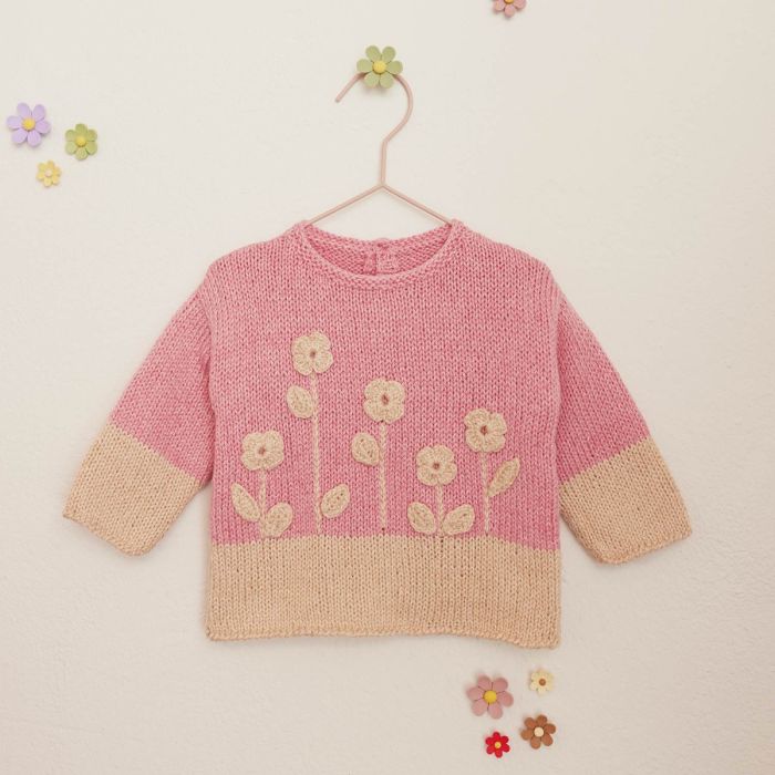 Knit this charming two-toned baby sweater with Eunoia by Concept by Katia, a blend of wool and cotton ideal for wearing year-round. Decorated with crochet flowers and finished with crab stitch edging, it combines style and comfort. Its back button fastening makes it easy to put on and take off. Follow the instructions in the Katia Baby 112 magazine and enjoy the benefits of knitting.