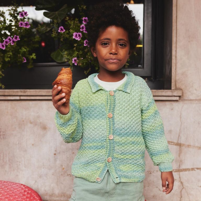 Knit a unique cardigan for your little one with Katia Marea, a yarn made from recycled fibers with a delicate tonal print. The design combines double seed stitch on the body and sleeves for texture and warmth, with a ribbed shirt-style collar. Fastened with buttons at the front, it’s a comfortable and colorful garment, perfect for any occasion.