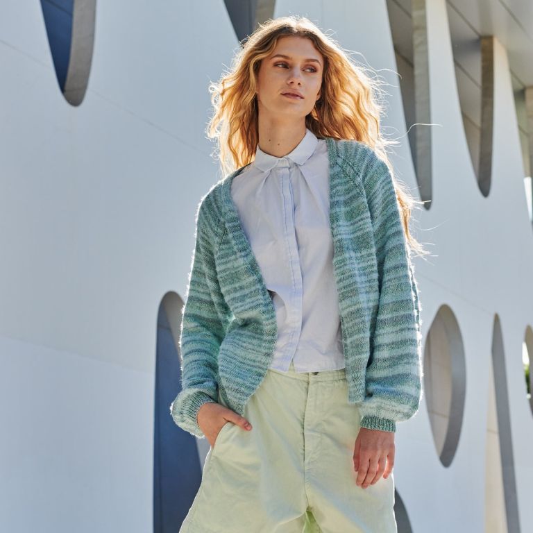 Knit a seamless cardigan using Lua by Concept by Katia, a fantasy yarn with a soft and unique gradient effect. Designed top-down in stockinette stitch, with puffed sleeves, a V-neckline, and lace details at the raglan increases, this cardigan is perfect for cool summer days, paired with shorts or trousers. Give yourself a moment of calmness and creativity with each stitch.