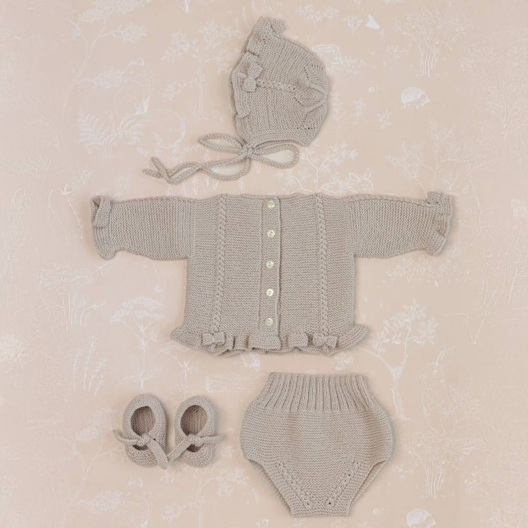 This delicate newborn-sized sweater is a comfortable and special piece for the first weeks of their life. Knitted in garter stitch using Concept Merino Baby or Katia Peques, it features fine cables on the front. Ruffles and little bows on the cuffs and hem add a charming touch. Knit a unique garment for your baby with love.